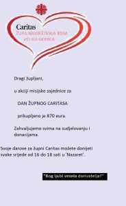 Dragi župljani, U akciji misijske zajednice za dan župnog Caritasa prikupljeno je 870 Eura. Zahvaljujemo svima na sudjelovanju i donacijama. Svoje darove za župni Caritas